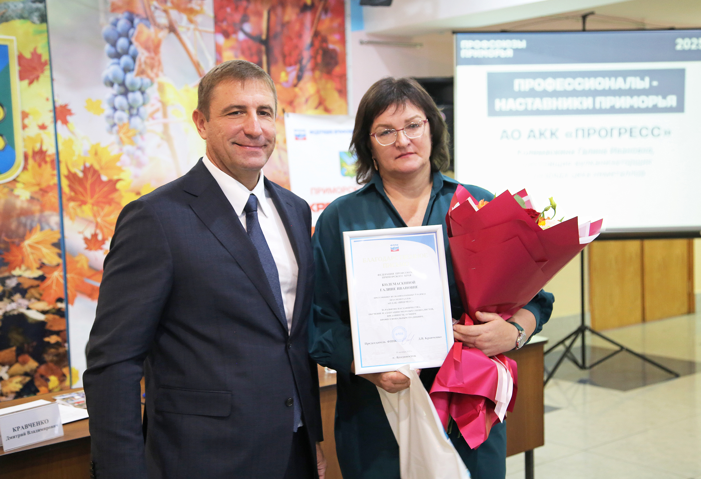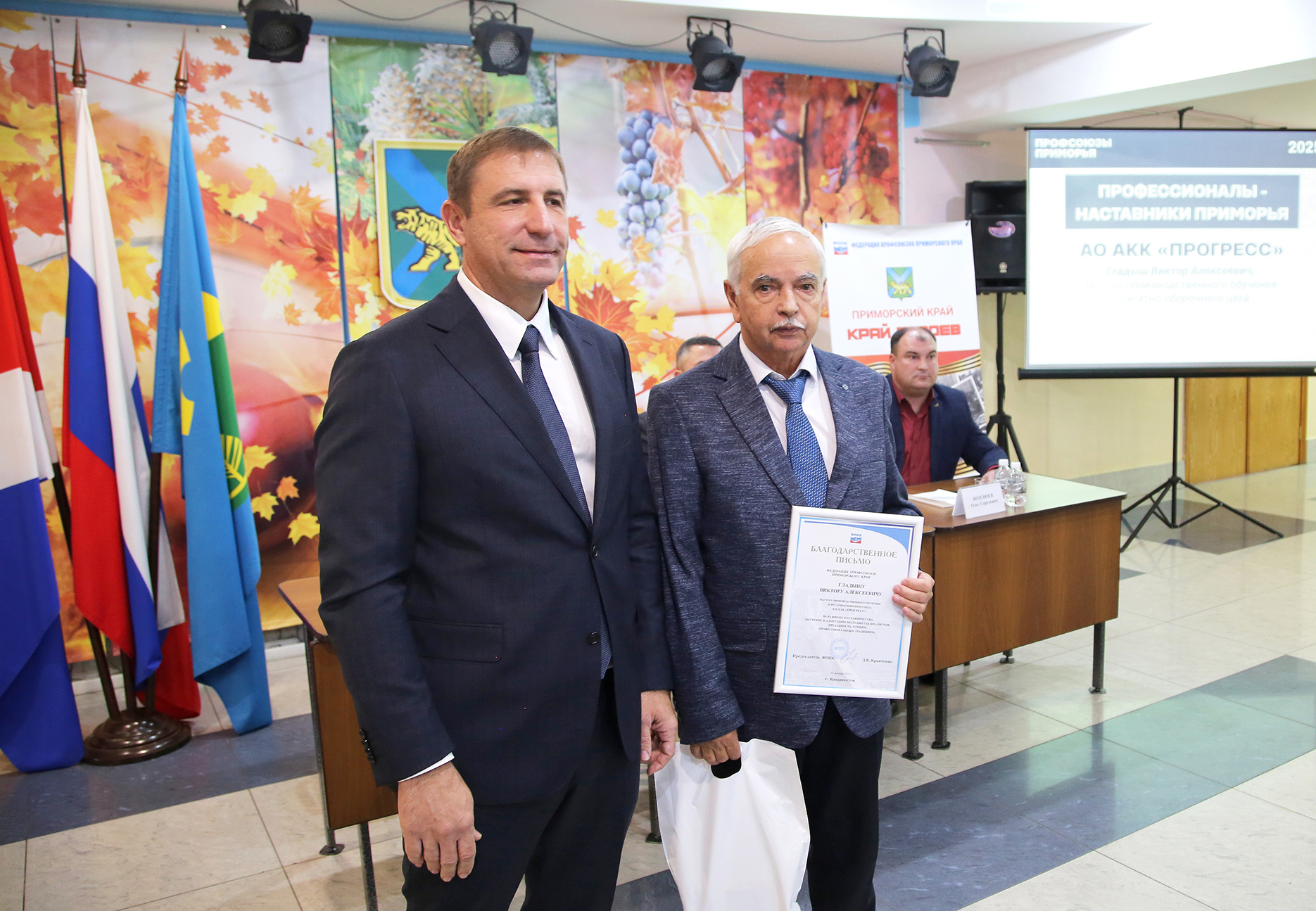 Вклад сотрудников АО ААК «ПРОГРЕСС» в развитие наставничества и обучение молодёжи был отмечен на краевом уровне — мастер производственного обучения агрегатно-сборочного цеха Виктор Алексеевич Гладыш и прессовщик-вулканизаторщик цеха неметаллов Галина Ивановна Колемаскина получили Благодарственные письма Федерации профсоюзов Приморского края в ходе Дня профсоюзов, организованного ФППК на территории Арсеньевского городского округа 30 октября.